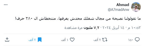 تويتة في أقل من سطر حصدت أكثر من 7 مليون مشاهدة و 150 رد، يطلب صاحبها أن يكتب كل شخص نصيحة في مجال عمله لا يعرفها الكثيرون.