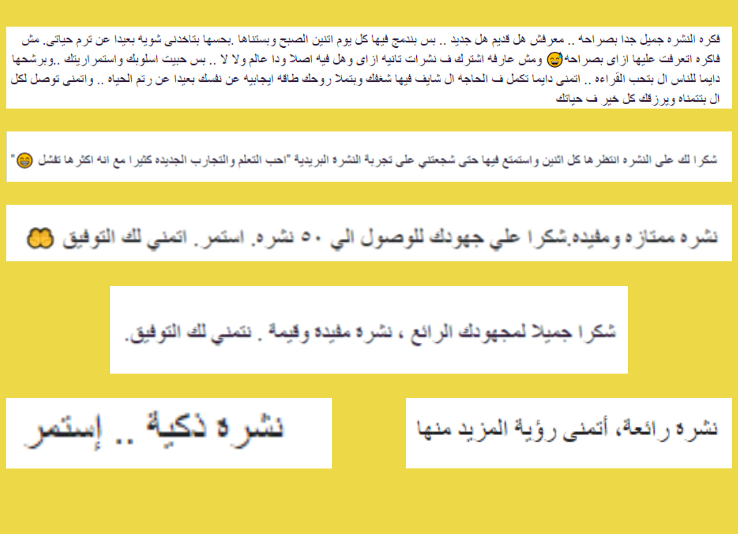 أشكر صاحب التقييم بدايةً وأبشره أنني بالفعل أخطط لإضافة فقرة جديدة ولهذا السبب وضعت في الاستبيان سؤال عن طول النشرة والحمد لله الإجابات مبشّرة تدعو لبدء العمل على تنفيذ الفكرة. وأتمنى كل مَن لديه فكرة أو اقتراح مثل صديقنا يرسله لي مباشرة بالرد على هذه الرسالة. لا حرمني الله من أفكاركم.